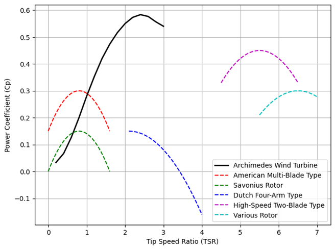 Fig. 14 shows the correlation between the TSR and Cp of different types of wind turbines with distinct characteristics. It can be seen that the Archimedes turbine has a maximum Cp value of about 0.59 at a TSR of 2.4, which is close to Betz's theoretical limit of 0.593 [45]. Compared to other low-speed wind turbines, such as the Savonius or American Multi-Blade, which can only reach Cp below 0.3, the Archimedes turbine exhibits much better aerodynamic performance in the low to medium TSR range. Meanwhile, high-speed turbine types such as the High-Speed Two-Blade have high Cp values (~0.4–0.45), operate at a TSR above five, and are unsuitable for areas with low wind speeds. With this in mind, the capacity of Archimedes turbines to achieve high efficiency at low TSRs makes it an ideal choice for rural or remote areas with low average wind speeds. Its efficient performance also shows excellent potential to be applied in distributed generation systems, especially in regions difficult to reach by conventional power grids.