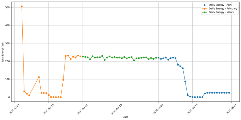 | Month | Observation Day | Total Energy (Wh) | Average for the Day (Wh) |