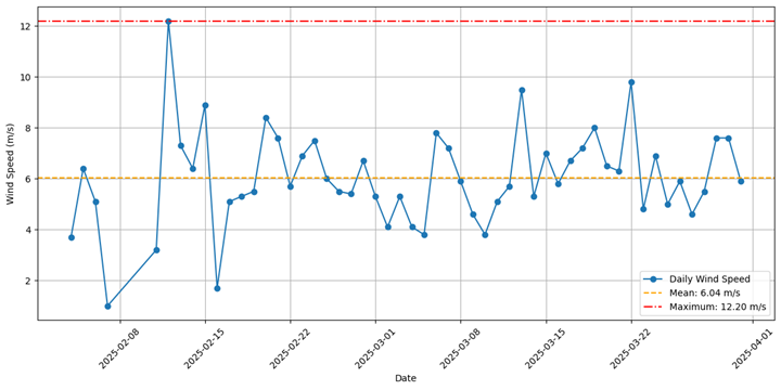 Data from February – April 2025 shows a significant increase in daily energy, from 542.36 Wh in February to 10,247.87 Wh in April. The daily average for 83 days reached 5,284.09 Wh. With two turbines, the total energy per day is estimated at 10,568.18 Wh, only sufficient for about 32.95% of the daily needs of tourist villages, which reach 32,075 Wh. This shows that wind-based systems have not been able to fully meet energy needs.