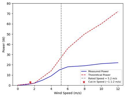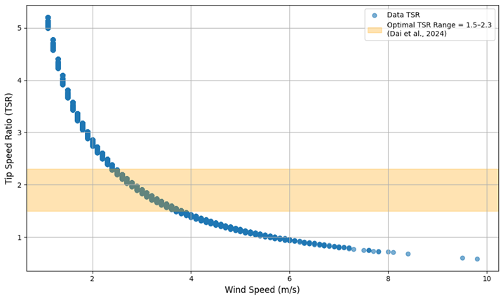- Strong TSR–Cp correlation (R² = 0.867) reveals high aerodynamic efficiency at low wind speeds.