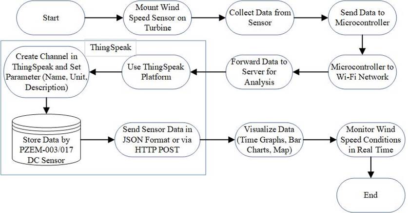 After the sensor is declared valid, data monitoring is carried out in real-time if the accuracy is more than 90% and with a minimal variance [41]. Key data was obtained from wind energy monitoring using the ThingSpeak platform, which records the performance of wind turbines in real time, following the steps shown in Fig. 4.