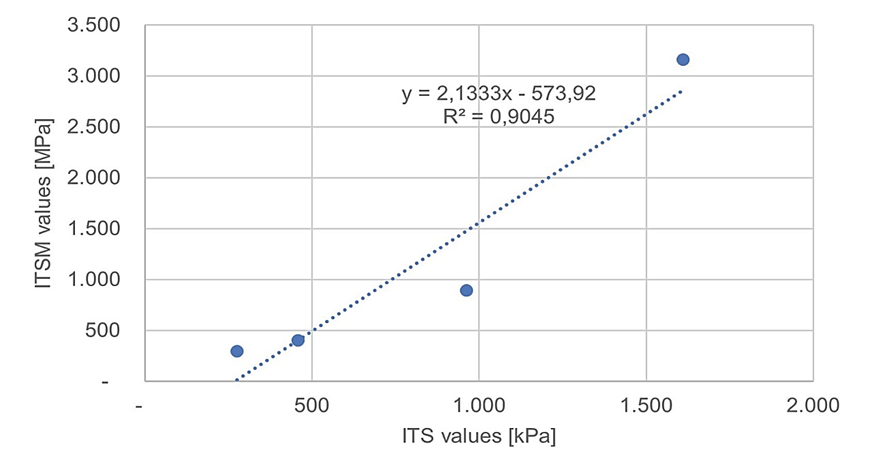 This study investigated the temperature‑dependent relationship between ITS and ITSM for SBS‑modified asphalt mixtures. The main findings are: