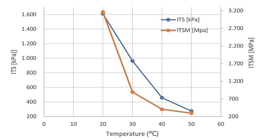 Table 6 and Fig. 2 present the average values obtained in this study. The experimental results demonstrate a clear inverse relationship between the test temperature and both the ITS and ITSM. As the temperature increased from 20°C to 50°C, the average ITS decreased from 1,610 kPa to 275 kPa, and the average ITSM decreased from 3,162 MPa to 296 MPa. These decreases in ITS and ITSM with increasing temperature highlight the thermal softening behavior of bituminous materials, i.e., reduced binder viscosity and weakened aggregate interlock with increasing temperature [17], [18], [21].