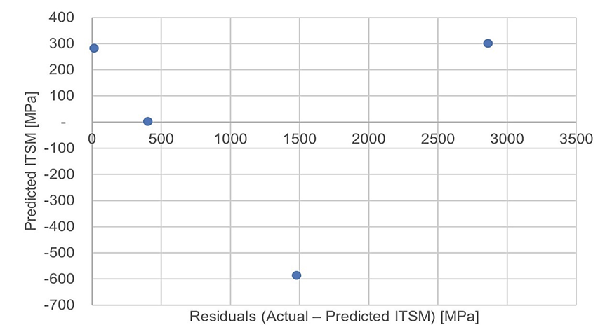 Residual analysis was conducted to assess the accuracy and consistency of the regression model (ITSM = 2.133 × ITS – 573.67), as mentioned in Equation (3). Conducting ITSM before ITS on the same specimens raises the possibility of deformation influencing subsequent strength measurements, particularly at 50°C. However, the nondestructive nature of ITSM, combined with controlled seating forces, minimized this effect. No measurable deformation was observed, and the influence on ITS results was negligible.